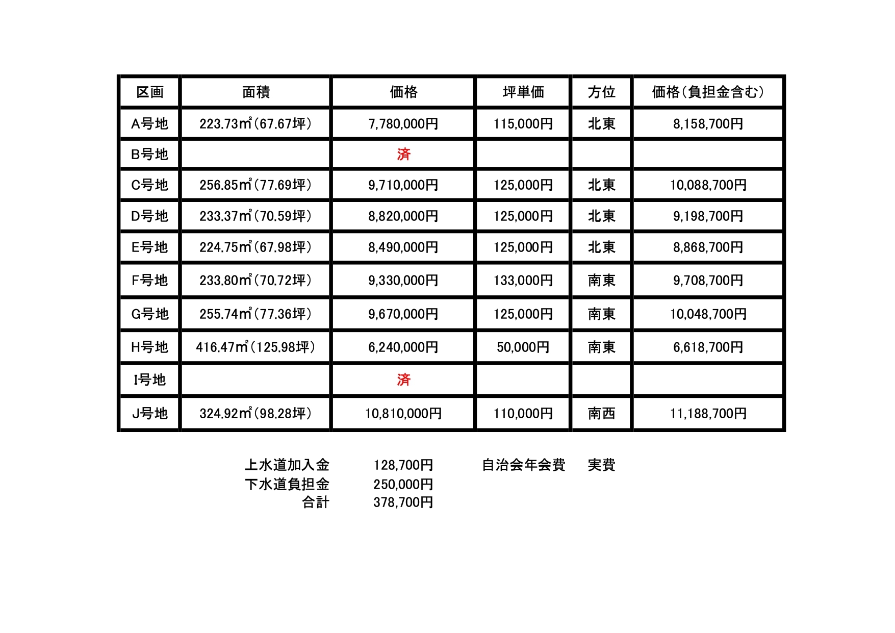 | 負担金 | 水道加入金:128,700円 下水道工事負担金: 250,000円 自治会水路使用料:3,000円(年間) |
